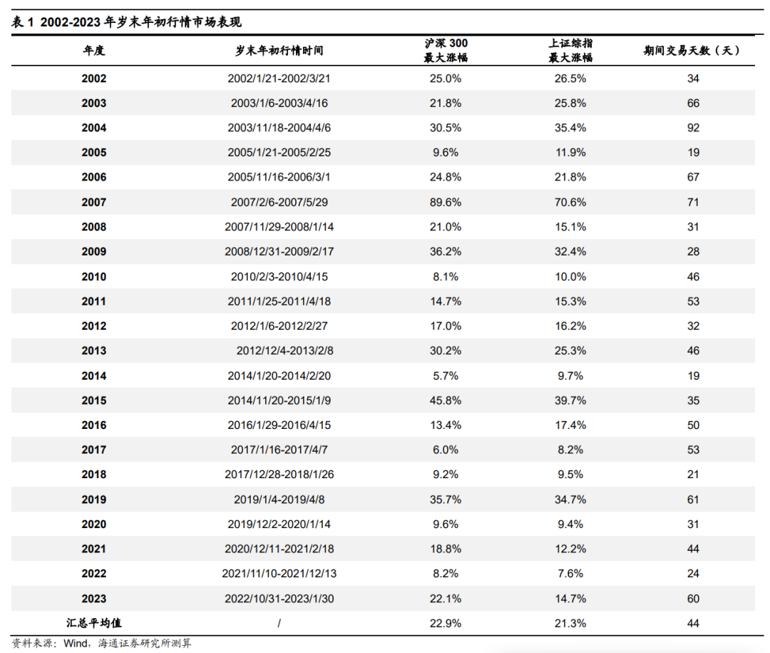 历史上在A股哪怕是单边熊市期间,年度视角下依然存在至少两次10%以上涨幅的机会,例如,08、11、18、22年。而今年年内仅有一波行情,包括去年10月底至今年1月底的整体性行情,以及今年2月至5月初的结构性行情,因此本轮10月末以来的行情也符合年内至少两波行情的历史规律。此外,当前已至岁末年初时,历史规律看岁末年初行情通常每年都有,春季行情具体的启动时间早晚往往与上年三四季度行情有关,若三四季度行情较弱,则春季行情启动偏早(10月下旬或11月初),若三四季度行情较好,则春季行情启动较晚(1月中下旬或2月初),详见下表。由于今年5-10月A股表现较弱,本轮岁末年初行情或已较早启动。