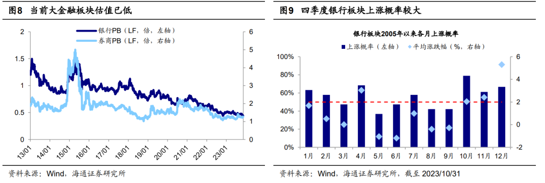 年底行情重视再平衡,关注大金融和医药。正如前文所述,历史上结构再平衡的背景往往是年底公募基金博弈增加和市场环境相对较弱,今年以来A股行情相对偏弱,5月初后上证指数陷入调整、最大回撤约15%,在此背景下低估的大金融和医药可能成为年底公募基金博弈的对象,具体来看:大金融方面,积极政策缓解市场担忧,低估的大金融有望迎来修复行情。今年以来市场对宏观环境的预期走弱使得大金融板块的估值承压,截至2023/11/15,银行PB(LF,下同)为0.44倍、处13年以来0.0%分位,证券为1.27倍、处14.7%分位。近期中央金融工作会议及后续政策有望缓解市场对金融板块的疑虑,银行、券商估值有望迎来修复。银行方面,中央金融工作会议提出“优化中央和地方政府债务结构”,近期特殊再融资债券发行逐渐落地,我们认为除了债务置换外的其他化债举措或将逐渐出台,或推动低估的银行板块估值修复。券商方面,中央金融工作会议提出活跃资本市场,培育一流投资银行和投资机构,我们认为随着政策落地推动股市交投回暖,券商业绩和未来发展有望受益。此外,从历史规律看,岁末年初大金融板块多异动,以银行为例,我们统计 05年1月以来,每月银行涨跌概率,发现银行板块上涨概率分别为 10月83%、11月61%、12月67%。