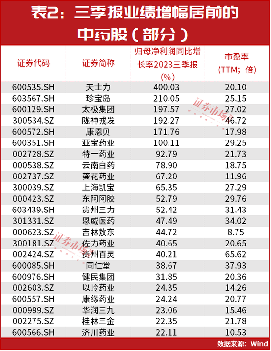 从中药公司此前披露的三季报可见,多数均实现了业绩显著增长。统计申万行业73只中药股显示,有48只实现了三季报业绩同比增长,占比超过六成,其中天士力、珍宝岛、太极集团等多只个股业绩增长实现翻倍。