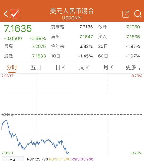 截至17时50分,在岸人民币对美元汇率最高触及7.1633,日内连破五道关口,刷新8月以来新高。离岸人民币对美元汇率日内上涨超500点,最高触及7.1659。