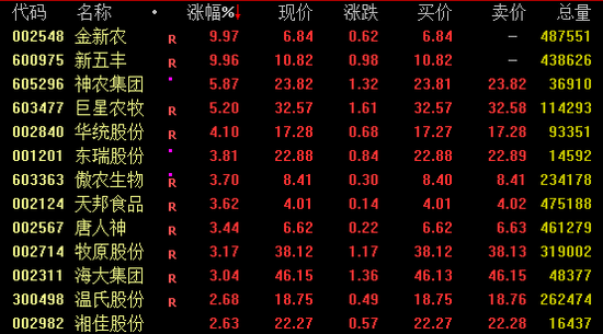 农业板块盘中拉升走高,猪肉、鸡肉概念股表现亮眼。截至收盘,金新农、新五丰涨停,巨星农牧、神农集团涨超5%,华统股份涨超4%,东瑞股份、牧原股份等涨超3%。