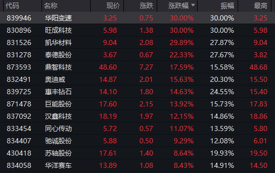 北交所其它个股亦表现亮眼,旺成科技、华阳变速“30cm”涨停,泰德股份涨超20%,鼎智科技涨超17%。