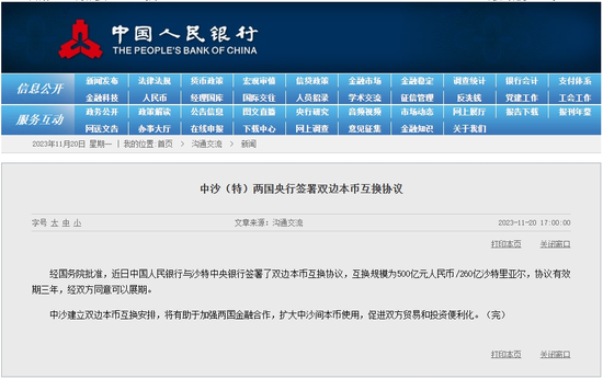此外,经国务院批准,近日中国人民银行与沙特中央银行签署了双边本币互换协议,互换规模为500亿元人民币/260亿沙特里亚尔,协议有效期三年,经双方同意可以展期。