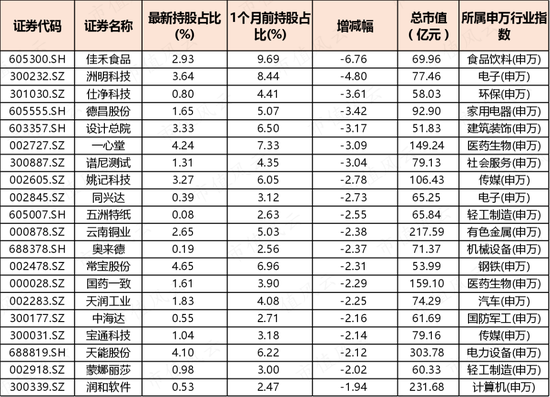 再来看看北向资金近期明显缩减在哪些股票上的持股占比。