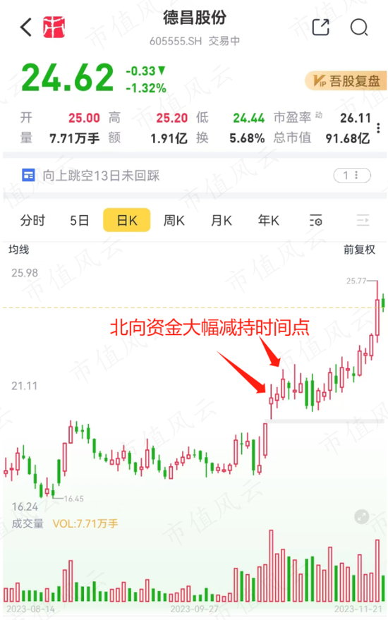 还有德昌股份,近期遭北向资金大幅卖出3.42个百分点,具体在10月25日和27日分别卖出105万和189万股,随后股价上涨超15%。