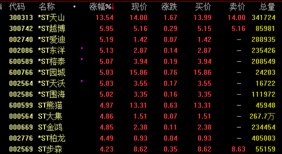 ST板块午后拉升走高,*ST天山(维权)涨超13%,*ST越博、*ST爱迪(维权)、*ST东洋(维权)、*ST榕泰(维权)等涨停。