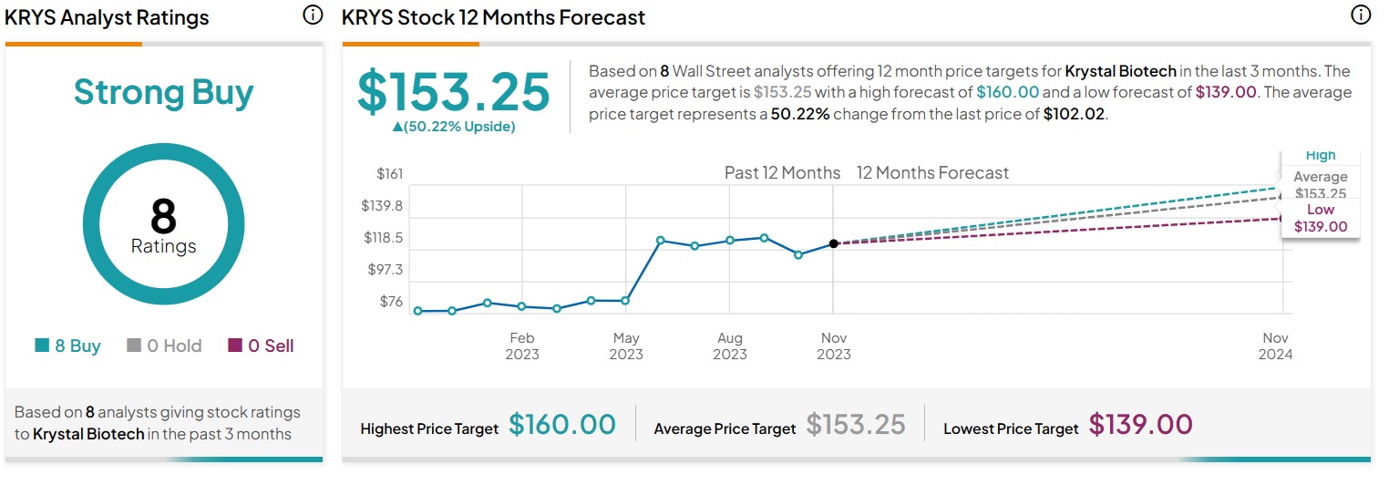 对Tan来说,这些评论支持了她对该股的买入评级,她给予的目标价则为160美元,意味着未来一年该股将稳步上涨大约58%。总体而言,机构汇编的华尔街分析师评级数据显示,Krystal的“强烈买入”评级可谓是华尔街分析师一致评级,基于8个积极的评论,表明华尔街分析师们一致认为该公司有一个良好的未来。该股目前定价为102.020美元,华尔街分析师平均目标价显示,平均目标为153.25美元,暗示一年左右的涨幅有望达到50%。