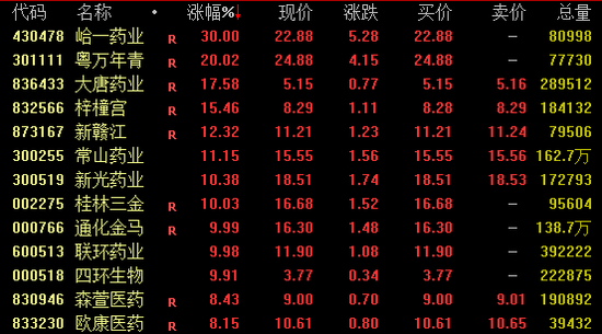 医药板块今日走势强劲,截至收盘,峆一药业“30cm”涨停,粤万年青“20cm”涨停,大唐药业涨超17%,桂林三金、通化金马、联环药业、四环生物等涨停。值得注意的是,四环生物已连续两日涨停。