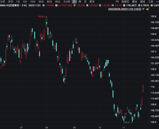 消息面上,百度发布2023年三季度财报,第三季度营收344亿元人民币,同比增长6%,超出市场预估的342.1亿元;归属于百度的净利润达73亿元,同比增长23%。另外,目前文心一言用户数已达7000万。