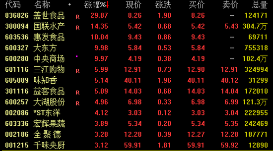 预制菜概念今日强势拉升,截至收盘,盖世食品“30cm”涨停,国联水产涨超14%,惠发食品、大东方、中央商场亦涨停,味知香、益客食品、大湖股份涨约5%。