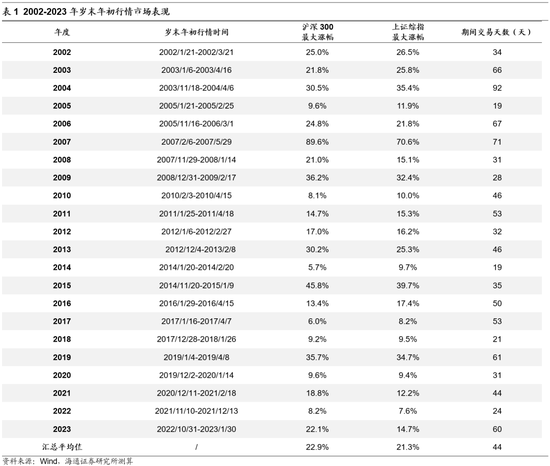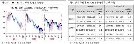 展望后市,我们认为本轮行情尚未结束,岁末年初行情正在徐徐展开。首先,在A股历史上哪怕是震荡市或者熊市期间,年度视角下依然存在至少两次10-15%左右涨幅的上涨机会,例如2011年、2018年和2022年。而反观今年,截至2023/11/25年内仅有一波行情,包括去年10月底至今年1月底的整体性行情,以及今年2月至5月初的结构性行情,因此,结合历史规律来看,我们认为随着国内宏微观基本面逐渐修复,且在海内外积极因素的催化下,后续A股有望迎来年内第二波机会。其次,当前已至岁末年初时,投资者很关心和期待岁末年初股市的行情。从历次岁末年初躁动行情回顾来看,岁末年初行情通常每年都有,背后的原因源自于岁末年初往往是重大会议召开时间窗口,同时11月到3月A股基本面数据披露少,开年投资者的风险偏好相对更高。春季行情具体的启动时间早晚往往与上年三四季度行情有关,若三四季度行情较弱,则春季行情启动偏早(10月下旬或11月初),若三四季度行情较好,则春季行情启动较晚(1月中下旬或2月初)。由于今年5-10月A股表现较弱,本轮岁末年初行情或较早启动。