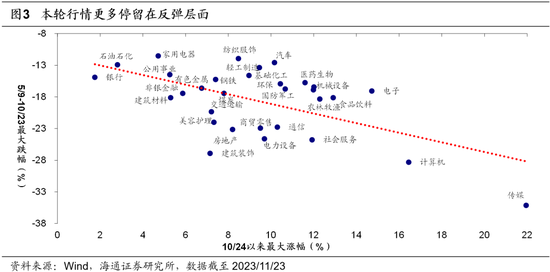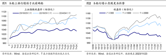 本轮上涨行情表现从弹性、节奏和结构上看均显纠结。今年10月24日以来(截至2023/11/24,下同)A股市场行情有所回暖,但涨势并不强劲,主要体现以下方面:首先,从弹性看,各大指数涨幅有限,自低点以来上证指数累计涨幅为3.5%、沪深300为1.8%、创业板指为3.9%,万得全A为5.6%;同时,如果对比此前两轮行情,即2022/4/26和2022/10/31开启的上涨,本轮行情表现也显得不够强劲(如图1)。其次,从节奏看,本轮行情走势较为犹豫,其中11月6日沪深300和创业板指达到阶段性高点后便开始回落,回吐大部分涨幅;与此同时,上证指数和万得全A虽未显著回调,但也开始横盘震荡,指数表现显著分化但整体而言都较为弱势。最后,从结构看,本轮上涨行情的动能和持续性欠佳:一方面,权重股表现落后,小盘行情特征明显,例如以沪深300为代表的大盘股涨幅不大且早早开始回调,相反以中证1000或中证2000为代表的中小股涨幅更大且仍在持续(如图2),由此说明市场动能尚不足以支撑大盘股上涨,也是指数表现弱的原因;另一方面,本轮行情更多停留在反弹层面,缺乏持续上涨的主线,我们将申万一级行业自2023/5/9(上证指数阶段性见顶)以来的最大跌幅和2023/10/24以来的最大涨幅做对比分析(如图3),可以发现两者呈现显著的正相关关系,相关系数近0.6;如果看过去5周各行业涨跌幅的排名,没有行业能够持续排在前10位,仅医药有4周涨幅排名前10位,多数行业的上涨没有持续性。