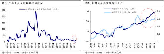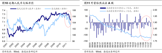行情纠结的原因2:资金面看,存量格局延续,外资仍在流出。在宏观预期不稳定的情况下,资金面也呈现出明显的存量格局,投资者在不确定性仍强时更多选择观望。从市场成交额看,10月23日全A成交额萎缩到7217亿元,随着市场开始上涨,成交额一度放大至11月6日的1.07万亿,但此后下滑至9000亿上下波动,也正是由于成交额没能持续放大,市场在11月6日之后便陷入了震荡偏弱的格局。市场流动性停滞不前的原因在于股市缺乏更多资金流入。我们在前期报告《再融资新规如何影响股市资金面?-2023/11/11》中分析过,随着活跃资本市场的政策持续落地,股市资金流出已经放缓,A股资金面供求失衡的压力得到缓解。但是资金流入依然缓慢,内资方面,公募基金仓位已经处于历史高位,23Q3普通股票型基金的权益仓位为88.8%,偏股混合型基金为87.1%,然而新发基金依然难有起色,10月和11月日均新成立偏股型基金份额仅为6.9亿份和10.3亿份,仍然处于过去5年低位。不过,近期杠杆资金活跃度有所提升,融资余额从10月23日的1.54万亿元增长590亿元至11月22日的1.60万亿元,但杠杆资金难以撑起大盘上涨,更多与上文所述的小盘股行情有关。外资方面,近期美联储降息预期升温,导致美元大幅贬值,人民币相应大幅升值,但未能吸引更多外资流入A股,相反本轮上涨期间北向资金依然在流出,只是流出速度放缓,10月24日以来北向净流出148亿元。