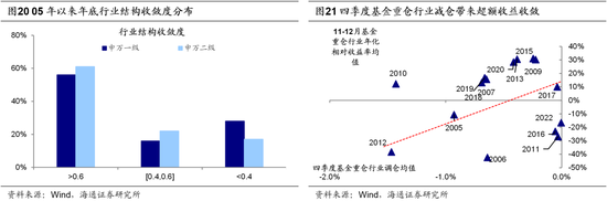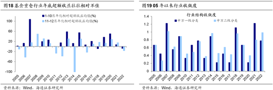 历史规律显示年底行业再平衡和基金重仓行业超额收益收敛概率较大。我们在前期报告《年底结构看均衡还是看分化?-20231118》中分析过,从基金重仓行业角度看,年底基金重仓超额收益往往出现收敛。历史上尽管多数年份前期公募基金能跑赢大盘,但年底公募基金重仓行业超额收益往往相对不佳,轻仓的行业表现反而相对较好,历年1-10月基金重仓行业年化超额收益均值为23.1个百分点,而11-12月仅为-5.0个百分点。从全部行业的角度看,历史上约6成年份年底行业结构出现再平衡,仅2成左右延续分化。如果用“年底2个月表现前30%的行业中前10个月表现在后30%的占比+年底2个月表现在后30%的行业中前10个月表现在前30%的占比”来衡量行业结构的变化情况,申万一级行业分类下05年以来年底行业结构收敛度大于0.6的年份占比为56%(二级行业分类下为61%,下同),收敛度小于0.4的年份占比为28%(17%),收敛度在0.4~0.6之间的年份占比为16%(22%)。