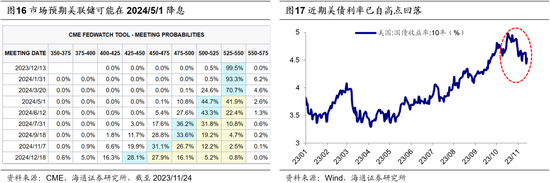 往后看,海内外积极因素有望进一步催化行情展开。国内方面,10月30日-31日中央金融工作会议在北京召开,会议要求“建立防范化解地方债务风险长效机制,建立同高质量发展相适应的政府债务管理机制,优化中央和地方政府债务结构”,同时再次强调“活跃资本市场”,我们预计活跃资本市场相关政策或将加速落地。11月8日2023金融街论坛年会上央行行长潘功胜表示下一阶段货币政策将更加注重跨周期和逆周期调节,必要时还将对债务负担相对较重地区提供应急流动性支持。11月17日央行、金融监管总局、证监会联合召开金融机构座谈会,提出要统筹考虑今年后两个月和明年开年的信贷投放,以信贷增长的稳定性促进我国经济稳定增长;要一视同仁满足不同所有制房地产企业合理融资需求,对正常经营的房地产企业不惜贷、抽贷、断贷。11月20日国务院总理李强主持召开中央金融委员会会议,强调要着力提升金融服务经济社会发展的质量水平,在保持货币政策稳健性的基础上,加大对重大战略、重点领域和薄弱环节的支持力度。海外方面,外部环境正迎来多重利好:一是近期中美关系已出现积极变化,美国当地时间11月15日中美双方高层举行会晤,两国元首同意推动和加强中美各领域对话合作,包括建立人工智能政府间对话、明年早些时候大幅增加航班等,未来中美关系有望步入新阶段;二是美联储加息周期或已近尾声,10月美国CPI超预期降温,截至2023/11/24市场预期美联储可能在明年5月1日的会议上宣布降息,近期长短端美债利率已从高位回落。综合来看,海内外多重利好下,A股市场情绪和风险偏好有望得到提振,或催化行情继续展开。