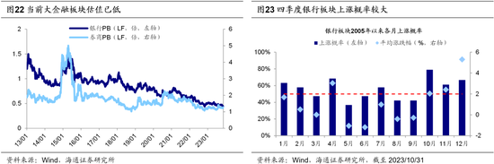 大金融方面,积极政策缓解市场担忧,低估的大金融有望迎来修复行情。今年以来市场对宏观环境的预期走弱使得大金融板块的估值承压,截至2023/11/24,银行PB(LF,下同)为0.44倍、处13年以来0.4%分位,证券为1.25倍、处12.8%分位。近期中央金融工作会议及后续政策有望缓解市场对金融板块的疑虑,银行、券商估值有望迎来修复。银行方面,中央金融工作会议提出“优化中央和地方政府债务结构”,近期特殊再融资债券发行逐渐落地,我们认为除了债务置换外的其他化债举措或将逐渐出台,或推动低估的银行板块估值修复。券商方面,中央金融工作会议提出活跃资本市场,培育一流投资银行和投资机构,我们认为随着政策落地推动股市交投回暖,券商业绩和未来发展有望受益。此外,从历史规律看,岁末年初大金融板块多异动,以银行为例,我们统计 05年1月以来,每月银行涨跌概率,发现银行板块上涨概率分别为 10月83%、11月61%、12月67%。