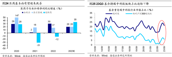 此外,低估低配的医药也有望迎来再平衡。目前医药生物板块的估值和基金配置仍处于较低水平,其中医药PE处13年以来19.0%分位,23Q3基金对医药超配比例处13年以来45%分位。往后看,医疗反腐对行业的影响逐渐过去,并且中期来看我国人口老龄化正在加深,未来医疗需求将持续增加,市场对医药行业基本面预期有望扭转,未来一段时间医药的估值及公募基金等机构的持仓有望趋于均衡,前期跌幅较明显的医药生物板块有望受益,结合行业分析师预测,医药子领域中创新药/医疗器械/血制品23年归母净利有望达到35%/20%/20%。