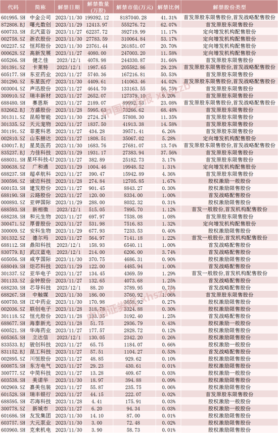 Wind数据显示,中金公司11月30日将解禁19.94亿股,为首发原股东限售股份和首发战略配售股份。曙光数创11月29日将解禁1.24亿股,均为首发原股东限售股份。北汽蓝谷11月27日将解禁6.22亿股,均为定向增发机构配售股份。浙农股份11月30日将解禁2.78亿股,均为定向增发机构配售股份。