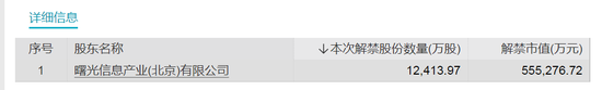 下周解禁市值第二大的为曙光数创,解禁股东为曙光信息产业(北京)有限公司,为曙光数创第一大股东。