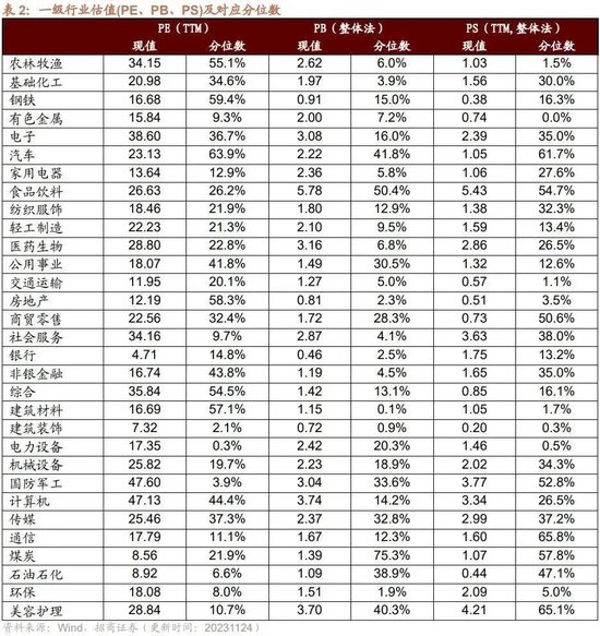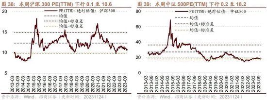 本周全部A股估值水平较上周下行。截至11月24日收盘,全部A股PE(TTM)为13.7,处于历史估值水平的27.7%分位数。创业板PE(TTM)下行0.8至32.5,处于历史估值水平的6.7%分位数。代表大盘股的沪深300指数PE(TTM)下行0.1至10.6,处于历史估值水平的22.0%分位数。代表中小盘股的中证500指数PE(TTM)下行0.2至18.2,处于历史估值水平的14.2%分位数。