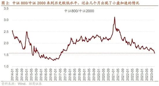 中证800和中证2000的比值也来到了历史较低水平,而且过去几个月出现了小盘占优加速的情况,非常像2021年1月之后大盘加速改善的镜像。