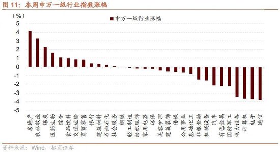 从行业上来看,本周申万一级行业涨多跌少。具体来看,房地产、农林牧渔、煤炭板块涨幅居前,分别上涨3.87%、3.59%、3.19%。通信、电子、计算机等跌幅居前。本周上涨板块主要原因,房地产(一线城市新楼市政策出炉;第二支箭持续发力),农林牧渔(厄尔尼诺现象延续,部分农产品价格高位运行),煤炭(煤矿安检致使煤炭供应侧收紧,双焦表现强势);跌幅较大的行业原因,计算机(市场轮动),电子(前期涨幅过大,本周调整),通信(算力板块本周调整对板块形成压制)。