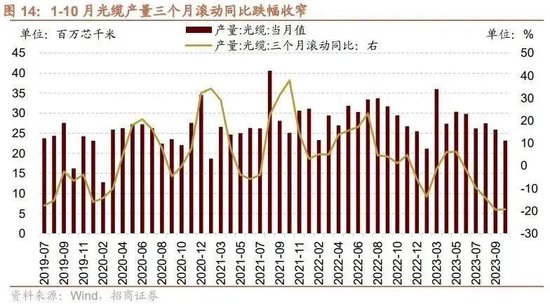 10月光缆产量三个月滚动同比跌幅收窄。10月光缆产量为23.18百万芯千米,三个月滚动同比跌幅收窄0.14个百分点至-19.27%。1-10月光缆产量为268.80百万芯千米,同比跌幅扩大1.40个百分点至-9.10%。