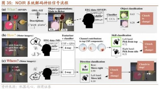 该系统基于非侵入式的脑电图(EEG)技术。据介绍,该系统依据的主要原理是分层式共享自治,即人类定义高层级目标,而机器人通过执行低层级运动指令来实现目标。该系统纳入了神经科学、机器人学和机器学习领域的新进展。NOIR的关键技术贡献包括一个模块化的解码神经信号以获知人类意图的工作流程。从神经信号解码出人类意图目标是极具挑战性的,该团队的做法是将人类意图分解为三大组分:要操控的物体(What)、与该物体交互的方式(How),交互的位置(Where)。他们的研究表明可以从不同类型的神经数据中解码出这些信号,这些分解后的信号可以自然的对应于参数化的机器人技能,并且可以有效的传达给机器人。