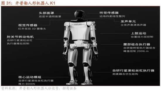 开普勒发布其首款人形机器人。11月17日,开普勒发布其首款人形机器人K1,身高178cm,体重85kg,并且加装灵巧手。在硬件方面,开普勒人形机器人肘关节和小腿使用自研行星滚柱丝杠执行器,推力可达8000N;腰部使用自研旋转执行器,峰值扭矩达200Nm,重复定位精度达0.01度;使用位置扭力双控制,搭载红外双目3D摄像头、立体声扬声器、远场四麦听觉传感器,可以做到出色的与外界交互能力。软件算法方面,K1使用自研星云系统,每秒算力可达100TOPS,通过视觉slam实现3D建模感知周围环境。软硬件配合下,目前K1可以实现诸如手眼协同操作、复杂地形行走、负重搬运等工作。