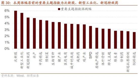 本周A股主要指数跌多涨少,万得全A指数周度下跌0.95%,沪深300指数下跌0.84%,创业板指下跌2.45%。A股涨幅居前的重要主题指数为次新股、新型工业化、新冠特效药。