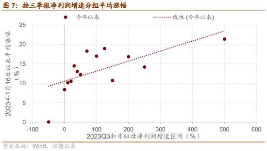 反过来说,今年以来我们将今年前三季度股价表现进行分组计算平均涨幅,我们和往常一样获得了一条向上的趋势线,表明业绩增速越高平均表现就越好,只是可能今年业绩增速较高的表现集中在一些大家不太熟悉的行业。