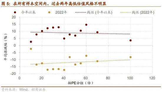 在5300只样本空间按照年初的估值进行分组后统计平均涨幅,今年以来,高低估值风格并不明显,其实2022年的情况比较类似。这与我们的感受不一致。