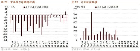 从资金需求来看,重要股东由净增持转为净减持,计划减持规模提升。本周重要股东二级市场增持5.2亿元,减持49.1亿元,净减持44.0亿元,由净增持转为净减持。其中,净增持规模较高的行业包括有色金属、美容护理、公用事业等;净减持规模较高的行业包括电子、非银金融、医药生物等。本周公告的计划减持规模为2.2亿元。