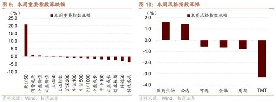 本周A股主要指数跌多涨少,北证50一枝独秀。主要指数中,北证50周度上涨20.96%,除此之外,仅消费龙头、小盘价值和大盘价值上涨,分别上涨1.03%、0.63%和0.30%;科技龙头、创业板指和大盘成长跌幅居前,分别下跌3.81%、2.98%和2.45%。从成交量上来看,本周日均成交8877.42亿元,日均成交较前一周上行1.03%。南向资金本周净流出港股4.06亿港元,北向资金本周净流出31.61亿元。