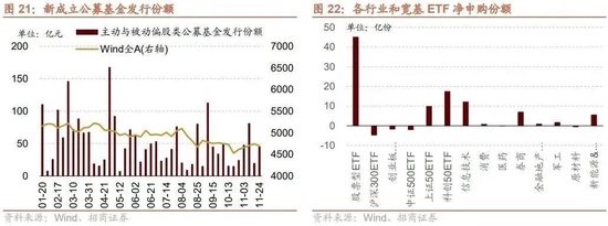 从ETF净申购来看,ETF净申购,宽指ETF申赎参半,其中科创50ETF申购较多,沪深300ETF赎回较多;行业ETF以净申购为主,其中信息技术ETF申购较多,原材料ETF赎回较多。具体来看,股票型ETF总体净申购45.2亿份。其中,沪深300、创业板ETF、中证500ETF、上证50ETF、双创50ETF和科创50ETF分别净赎回4.9亿份、净赎回1.9亿份、净赎回2.1亿份、净申购10.0亿份、净申购2.2亿份、净申购17.6亿份。行业方面,信息技术ETF净申购12.3亿份;消费ETF净申购0.9亿份;医药ETF净赎回0.2亿份;券商ETF净申购7.1亿份;金融地产ETF净申购1.0亿份;军工ETF净申购1.8亿份;原材料ETF净赎回0.7亿份;新能源&智能汽车ETF净申购5.6亿份。
