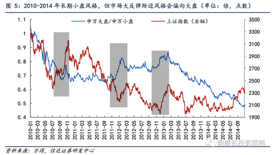 另一个短期的干扰因素是指数的超跌反弹或反转。2010年下半年、2011年底-2012年Q1、2012年底-2013年初,上证综指出现了3次较大的反弹或反转,期间小盘的超额收益都出现了阶段性的回撤。