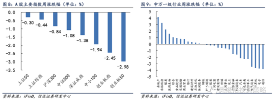上周A股主要指数均下跌,创业板50指数(-2.98%)领跌,申万一级行业涨跌分化,其中房地产(4.17%)、农林牧渔(3.28%)、煤炭(2.26%)领涨,通信(-3.82%)、电子(-3.72%)、计算机(-3.65%)领跌。概念股中,新股与次新股(8.23%)、蒙脱石散(5.99%)、基因编辑(5.6%)领涨,充电桩(-6.04%)、F5G概念(-5.50%)、MLOps概念(-5.31%)领跌。