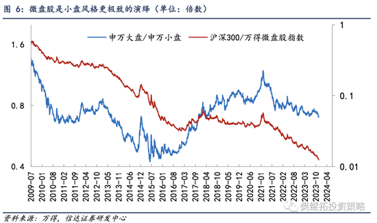 (3)微盘股是小盘股的极致演绎。微盘股指数由于指数构造上选择的个股市值更小,所以比我们用申万大盘指数/小盘指数度量出来的风格表现更为明显。但大趋势上是类似的。