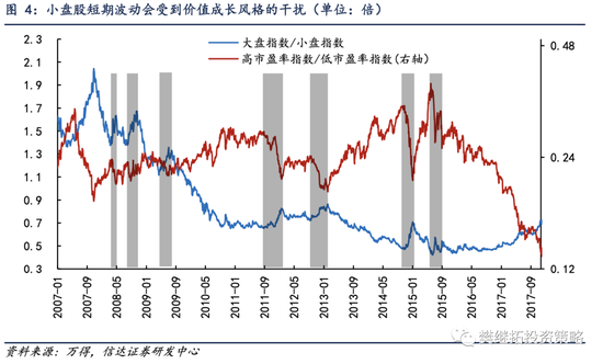 (2)小盘股短期波动会受到价值成长风格和指数大反弹的干扰。我们以2008-2016年,长期小盘风格为例,来看哪些因素会对长期小盘风格产生短期的干扰。第一个因素是价值成长风格(以高PE指数/低PE指数)。虽然小盘股是市值指数,但由于成长股中小盘股占比更多,价值股中大盘股更多,当市场短期风格快速偏向价值的时候,小盘风格往往会有一定时间的休整。这种干扰在时间维度上相关性很强,但空间上关系不大,比如2011年下半年-2013年初,价值风格超额收益很多,导致市场风格偏向大盘,但大盘在此期间仅仅小幅跑赢小盘。