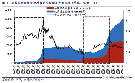 (1)长期大小盘风格主要取决于投资者结构变化。近期投资者对小盘风格的关注度较高,历史上大小盘风格主要取决于投资者结构的变化,受业绩的比较优势影响较小。以申万大盘/小盘指数为例,2002-2007年、2016-2021年是长期偏向大盘的风格,期间均伴随着公募主动权益型基金份额的快速增长,2016-2021年还有北上资金持续流入的影响。而2008-2016年中,公募权益型基金份额增长很慢,即使是2009年和2015年的牛市,公募权益基金份额也只是小幅增长,熊市和2014年牛市初期,权益型基金份额均是缓慢下降的。由此导致2008-2016年中,市场整体风格长时间偏向小盘。