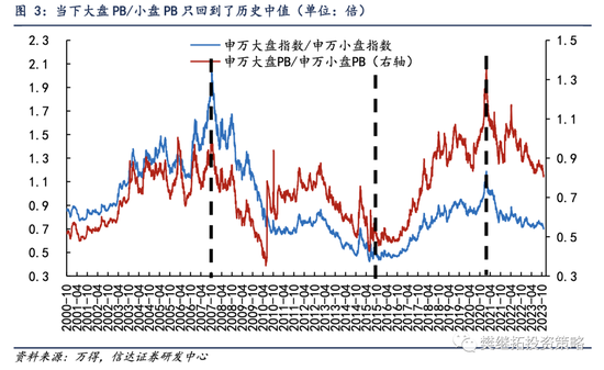 而且我们还可以看到,大小盘风格一旦变化,持续时间往往会比较长。2002-2007年大盘风格持续5年,2008-2016年中小盘风格持续8年,2017-2021年大盘风格持续5年。最终会让大盘PB/小盘PB从一个极值到达另一个极值,21年以来,申万大盘PB/小盘PB从历史高值快速回落,目前只回到了历史中位数水平,长期来看小盘股还可能有很大的估值提升空间。