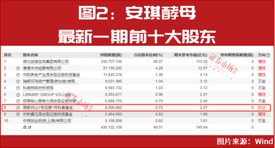 据上市公司公告,冯柳新进布局的这家公司是安琪酵母。截至11月20日,冯柳旗下高毅邻山1号远望基金(以下简称“邻山1号”)新进成为公司的第八大股东,持仓数量为650万股(见图2)。