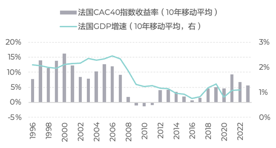 经济增速放缓以后,股市收益能够实现一定回升,但相比之前的高增速环境,后来的收益率又显得不那么具备吸引力。法国和英国是这种中间形态的代表。