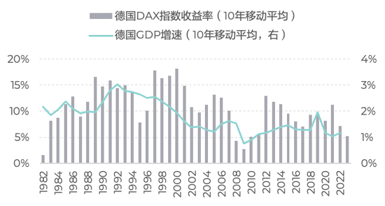 德国经济减速后,股市收益经先抑后扬,2012年以来的10年平均收益水平维持在10%左右。尽管低于80、90年代的水平,但这个收益水平相较英国、法国等成熟市场也是比较高的。
