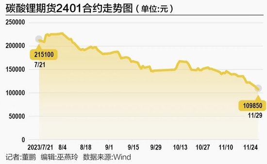 11月29日,碳酸锂2401合约再次增仓下行,午后续创上市以来新低。同日,上海有色统计的国内电池级碳酸锂现货市场均价为每吨13.19万元,连续30个交易日下跌。
