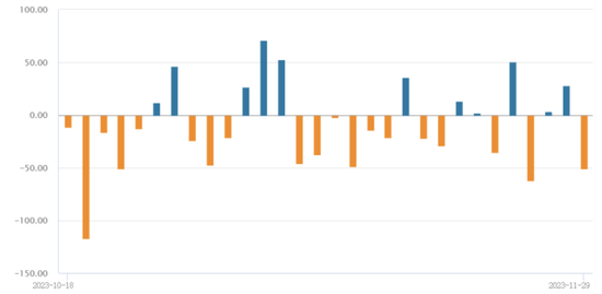 11月29日大盘全天震荡调整,三大指数均收跌。截至收盘,沪指跌0.56%,深成指跌0.91%,创业板指跌1.06%。盘面上,黄金概念股集体走强,芯片概念股表现活跃。下跌方面,房地产板块持续调整。总体上个股跌多涨少,全市场超3900只个股下跌。沪深两市11月29日成交额7750亿,较上个交易日放量22亿,北向资金全天净卖出50.80亿元。