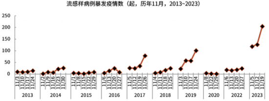 根据中国疾控中心发布的流感周报,流感阳性率和暴发疫情数再创新高,且显著高于往年同期水平。考虑到全国各地气温可能持续降低、且今年新一轮大规模流感疫苗接种尚未完成,流感疫情可能进一步加剧。