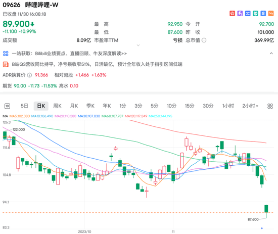 哔哩哔哩第三季度经调整净亏损收窄,但业务表现逊预期,加上有机构预期明年收入有下行风险,公司港股跌10.99%收于89.9港元,为年内新低。