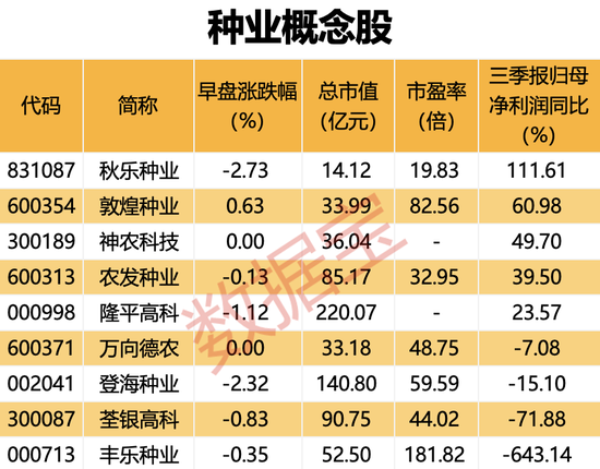 业绩上来看,5只种业股前三季度归母净利润实现增长,包括秋乐种业、敦煌种业、神农科技、农发种业、隆平高科。