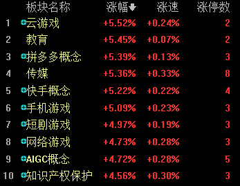 板块方面,游戏、教育、拼多多概念、传媒、AIGC概念等涨幅居前。